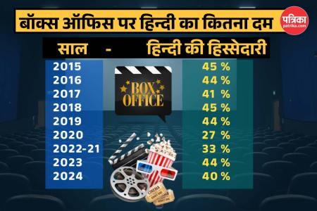 2024 में मूल रूप से हिन्दी में बनीं केवल छह फिल्में ही सौ करोड़ से ऊपर का कारोबार कर सकी थीं। बीते साल कुल बॉक्स ऑफिस कलेक्शन में हिन्दी की हिस्सेदारी दस साल (कोरोना काल के 2020-22 को छोडकऱ) में सबसे कम (40%) रही। यह तब है जब हिन्दी फिल्मों में दूसरी भाषाओं की डब की गई फिल्मों को भी शामिल रखा गया है।