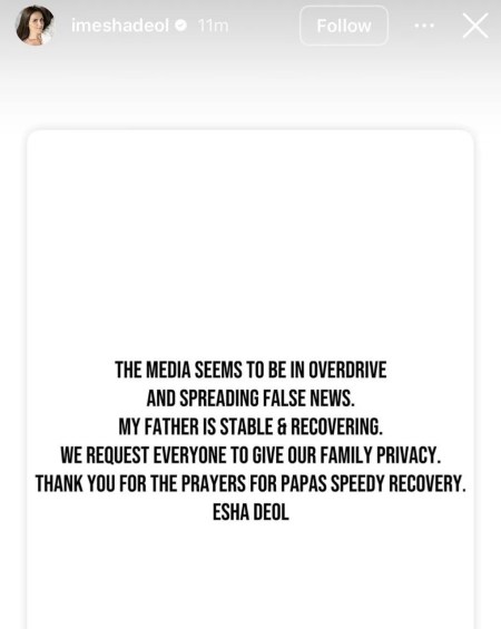 ईशा देओल ने भी पिता की मौत की खबर को झूठ बताते हुए लिखा था कि मंगलवार सुबह कई मीडिया वेबसाइट और चैनल ने पिता धर्मेंद्र की मौत की झूठी खबर प्रसारित की है। वह एक दम स्टेबल कंडीशन में है और रिकवर कर रहे हैं।