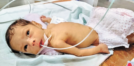 बच्ची का वजन 1.540 किग्रा है। बच्ची की सेहत में सुधार हो रहा है। फिलहाल बच्ची दूध कम पी रही है। सामान्य शिशु औसतन 30 मिली लीटर दूध पीता है। वर्तमान शिशु 10 मिली लीटर दूध ही पी रहा है। प्रत्येक 2 घंटे में शिशु को एसएनसीयू की नर्से फार्मूला दूध पीला रही है।