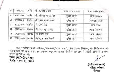 गोंडा जिले में एसपी विनीत जायसवाल ने एक बार फिर बड़े पैमाने पर फेर बदल किया है। इसके क्रम में चौकी प्रभारी जेल रोड अमरनाथ को कोतवाली नगर की चौकी तिवारी बाजार का प्रभारी बनाया गया है। शुभासु पाठक को मनकापुर कोतवाली से कोतवाली नगर की चौकी जेल रोड का प्रभारी बनाया गया है। मनोज कुमार सिंह को कोतवाली देहात से चौकी प्रभारी पांडे बाजार, जबकि पांडे बाजार चौकी प्रभारी सुरेश कुमार को मसकनवा चौकी की कमान सौपी की गई है। उपनिरीक्षक तेज नारायण गुप्ता को मसकनवा से उमरी बेगमगंज, उप निरीक्षक अशोक कुमार जायसवाल को नवाबगंज से कर्नलगंज कोतवाली की चौकी बालपुर, अशोक कुमार को पुलिस लाइन से चौकी प्रभारी पहाड़ा बाजार, उपनिरीक्षक सुरेश कुमार सिंह को पहाड़पुर से प्रभारी जन सूचना सेल, वरिष्ठ उप निरीक्षक कोतवाली नगर ब्रह्मानंद सिंह को पुलिस लाइन, जैद सिद्दीकी को कोतवाली नगर से पुलिस लाइन, उप निरीक्षक आनंद उपाध्याय को कोतवाली देहात से कोतवाली नगर, उपनिरीक्षक मुकेश कुमार को ख़ोडारे से चौकी प्रभारी नियावां थाना उमरी बेगमगंज,चौकी प्रभारी नियावां शिवकुमार यादव को थाना वजीरगंज, उप निरीक्षक अक्षय कुमार को कर्नलगंज कोतवाली, अरविंद यादव को पुलिस लाइन से कटरा बाजार, उप निरीक्षक अजय कुमार सिंह को पुलिस लाइन से कटरा बाजार, उपनिरीक्षक कमलेश कुमार यादव को पुलिस लाइन से थाना उमरी बेगमगंज, उप निरीक्षक अंगद कुमार सिंह को पुलिस लाइन से उमरी बेगमगंज, उपनिरीक्षक उत्कर्ष नवीन बरनवाल को करनैलगंज से कोतवाली देहात, उप निरीक्षक जयप्रकाश मिश्र को खरगूपुर से मोतीगंज, रामाशंकर यादव को उमरी बेगमगंज से पुलिस लाइन, सुधीर यादव को करनैलगंज से इटियाथोक, उप निरीक्षक प्रभाकर पांडे को थाना कौड़िया से वजीरगंज, उपनिरीक्षक रजनीश द्विवेदी को कटरा बाजार से उमरी बेगमगंज, उप निरीक्षक तरुण कुमार मिश्रा को पुलिस लाइन से न्यायालय सुरक्षा, लक्ष्मी सिंह को पुलिस लाइन से थाना छपिया, उमेश कुमार सिंह को पुलिस लाइन से थाना नवाबगंज, रविंद्र नाथ को पुलिस लाइन से थाना कौड़िया, सुरेंद्रनाथ तिवारी को पुलिस लाइन से थाना वजीरगंज भेजा गया है।