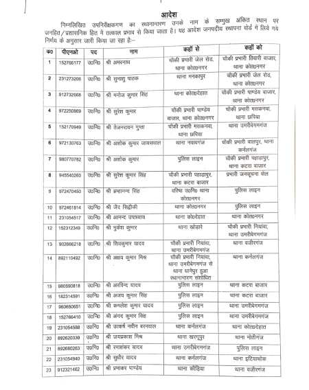 पुलिस अधीक्षक विनीत जायसवाल ने सब इंस्पेक्टर की तैनाती में बड़े पैमाने पर फेरबदल किया है। किसी को पुलिस लाइन से चौकी की कमान सौंपी गई है। वही तीन सब इंस्पेक्टर को पुलिस लाइन भेजा गया है। एसपी का यह कदम कानून व्यवस्था को चुस्त- दुरुस्त बनाए रखने के लिए अहम माना जा रहा है।