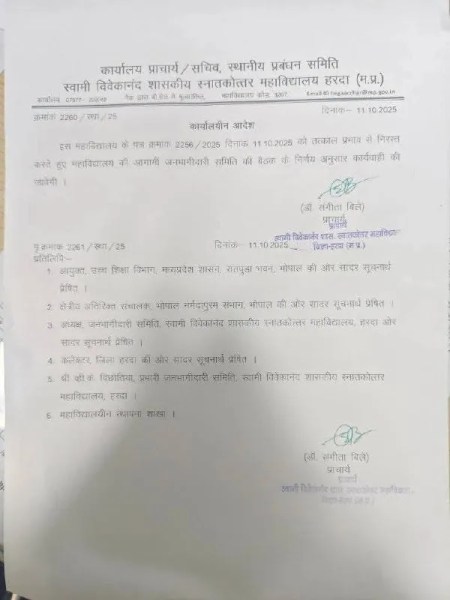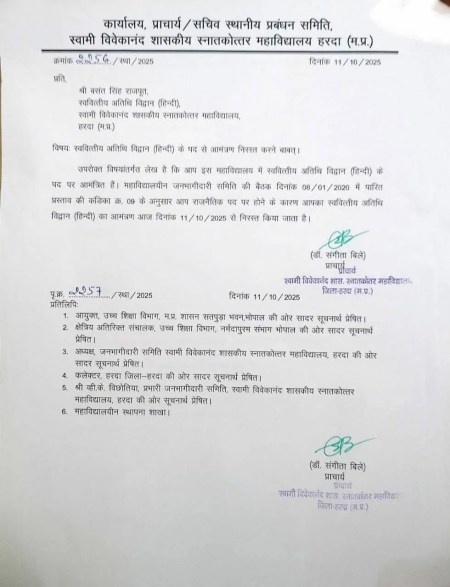guest lecturer appointed bjp zila mahamantri:मध्य प्रदेश के हरदा में स्थित पीएश्री कॉलेज (PM Shri college) में करीब 10 साल से भी अधिक समय से सेवारत हिंदी विषय के अतिथि विद्वान बसंतसिंह राजपूत (guest lecturer basantsingh rajput) को भाजपा में जिला महामंत्री नियुक्त किए जाने के बाद कॉलेज की प्राचार्य डॉ. संगीता बिले ने प्रशासनिक अधिकारी व्हीके बिछोतिया आदि से विचार विमर्श करने के बाद शनिवार को निष्कासित कर दिया। (mp news)