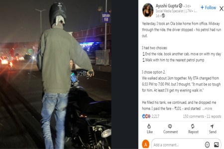 दरअसल, आयुषी गुप्ता नाम की युवती ने अपने ऑफिस से घर लौटने के लिए ओला बाइक बुक की थी। सफर के दौरान अचानक बाइक बीच रास्ते में रुक गई, क्योंकि पेट्रोल खत्म हो गया था। इसके बाद दोनों करीब एक किलोमीटर तक पैदल चले। आयुषी ने सोचा कि ड्राइवर के लिए यह स्थिति मुश्किल होगी, लेकिन उसने इसे शाम की सैर समझा।