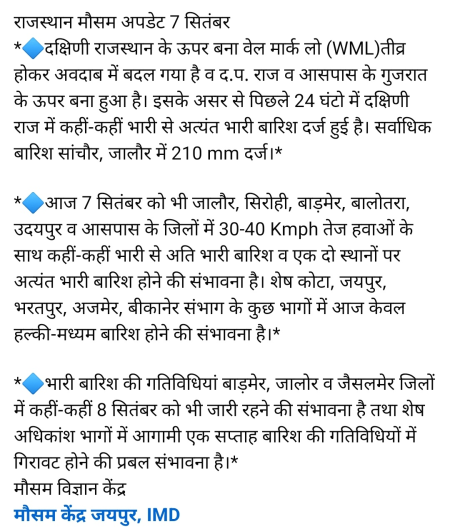 -दक्षिणी राजस्थान के ऊपर बना वेल मार्क लो तीव्र होकर अवदाब में बदल गया है व द.प. राज व आसपास के गुजरात के ऊपर बना हुआ है। इसके असर से पिछले 24 घंटों में दक्षिणी राज में कहीं-कहीं भारी से अत्यंत भारी बारिश दर्ज हुई है। सर्वाधिक बारिश सांचौर, जालौर में 210 एमए दर्ज की गई है।