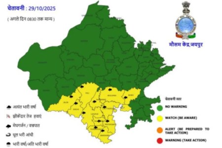 मौसम मौसम केन्द्र के अनुसार प्रदेश में में भारी बारिश की गतिविधियों में 29 अक्टूबर से कमी होने की संभावना है। हालांकि दक्षिणी व दक्षिण-पूर्वी भागों में आगामी 4-5 दिन हल्की मध्यम बारिश की गतिविधियां जारी रहने की संभावना है। केन्द्र के अनुसार पश्चिमी राजस्थान की सीमावर्ती क्षेत्र, बीकानेर संभाग व शेखावाटी क्षेत्र में आगामी 4-5 दिन मौसम शुष्क रहने की संभावना है।