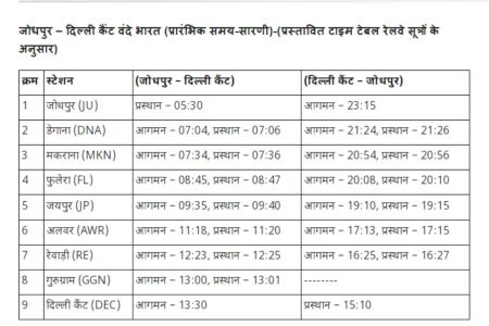 Jodhpur Delhi Vande Bharat Train: जोधपुर-दिल्ली कैंट वंदे भारत ट्रेन का आने-जाने का समय