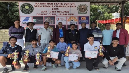 डेजर्ट क्लब में आयोजित तीन दिवसीय राजस्थान स्टेट जूनियर ओपन टेनिस प्रतियोगिता का समापन हुआ। जिला टेनिस संघ के तत्वावधान में हुई प्रतियोगिता के अंतिम दिन अंडर–18 बालक युगल वर्ग का रोमांचक फाइनल खेला गया। आर्यन कनरवाल और जीवम ओला की जोड़ी ने उत्कृष्ट खेल का प्रदर्शन करते हुए प्रियांस तंवर और हर्ष डीढारिया को कड़े मुकाबले में 10–8 से हराया। इस जीत के साथ आर्यन ने प्रतियोगिता के एकल और युगल—दोनों खिताब अपने नाम किए।