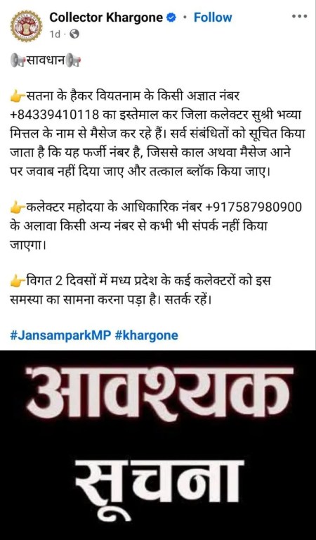 cyber fraud using Collector photo: सायबर ठगी के मामलों में आमजन, कर्मचारियों के साथ अब खरगोन जिले के प्रशासनिक अधिकारी भी सुरक्षित नहीं है। ठगी के नित नए तरीके अपनाने वाले सायबर ठगों ने इस बार कलेक्टर भव्या मित्तल (Collector Bhavya Mittal) का फोटो इस्तेमाल कर जिला अधिकारियों से राशि लेने का प्रयास किया है। (mp news)