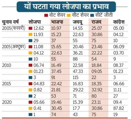 बिहार विधानसभा चुनाव में 2005 से लगातार लोजपा कमजोर ही होती जा रही थी। 15 सालों में 29 से एक सीट पर पहुंच गई थी, लेकिन इस बार स्थिति अलग दिखाई दी रही है।