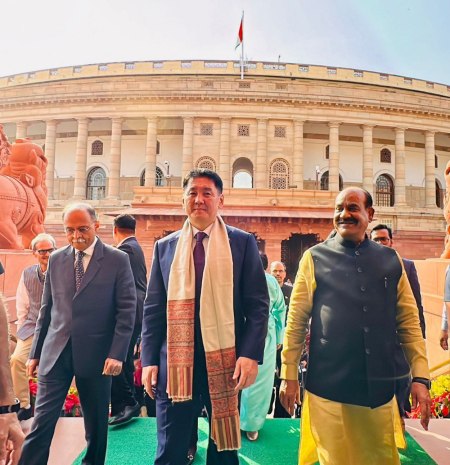 नई दिल्ली। मंगोलिया के राष्ट्रपति खुरेलसुख उखना ने अपने प्रतिनिधिमंडल के साथ संसद भवन का दौरा किया। लोकसभा अध्यक्ष ओम बिरला ने मकर द्वार पर उनका गर्मजोशी से स्वागत किया। प्रतिनिधिमंडल ने संसद भवन की वास्तुकला की भव्यता, कलात्मक शालीनता, और समृद्ध सांस्कृतिक विरासत की प्रशंसा की, जबकि उन्होंने नए संसद भवन में प्रदर्शित भारत की जीवंत लोकतांत्रिक परंपराओं को देखा।