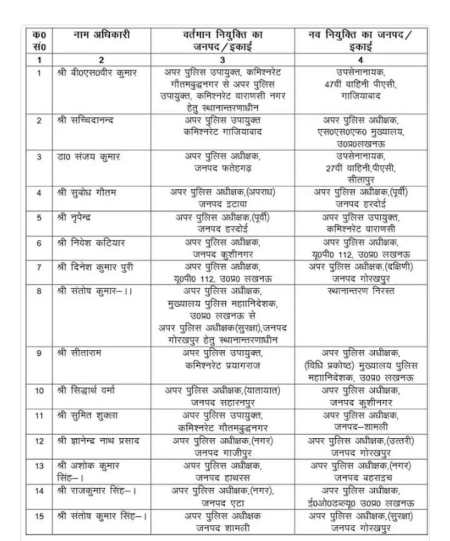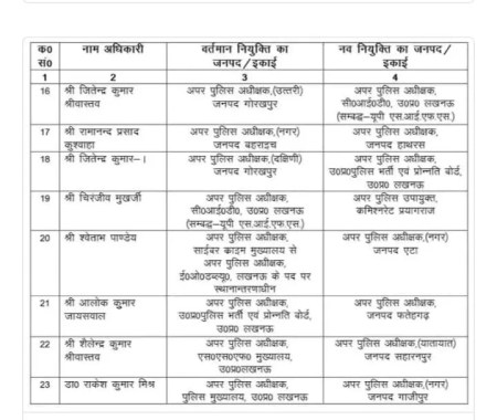 योगी सरकार ने रविवार को पुलिस विभाग में एक बार फिर बड़े पैमाने पर ट्रांसफर किया गया है। तबादलों की सूची जारी कर दी गई है। कई जिलों की कमान और जिम्मेदारियों का स्वरूप बदल दिया। सरकार द्वारा घोषित इस फेरबदल में 23 एडिशनल एसपी रैंक के अधिकारियों का ट्रांसफर किया गया है। जबकि दो अफसरों के आदेशों में विशेष संशोधन किया गया। इस प्रक्रिया का केंद्र उन अधिकारियों पर भी रहा है। जिनके तबादले पूर्व में विवाद या विशेष परिस्थितियों के कारण समीक्षा में थे।