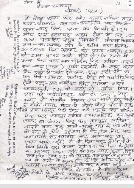 दुलारचंद यादव के पोते नीरज कुमार के बयान पर सबसे पहला भदौर थाना में एफआईआर दर्ज की गई है। इसमें अनंत सिंह, राजवीर सिंह, कर्मवीर सिंह, छोटन सिंह और कंजम सिंह को नामजद बनाया गया है। नीरज की ओर से थाने में दिए गए आवेदन में लिखा है कि गुरुवार को प्रचार के दौरान अनंत सिंह अपने समर्थकों के साथ पहुंचे और मेरे दादा दुलारचंद यादव के साथ बकझक करने लगे। इसपर विवाद शुरू हो गया। इसके बाद अनंत सिंह के दोनों भतीजे वहां आ गए और उन लोगों ने गोली चला दी। जो कि दादा के पैर में लगी। इसके बाद छोटन व कंजम सिंह ने थार गाड़ी उनके ऊपर चढ़ा दी जिससे उसकी मौत हो गई। इस मामले में हत्या और साजिश से संबंधित धारा 103, 3(5), BNS 2023 तथा आर्म्स एक्ट की धारा 27 लगाई गई है।