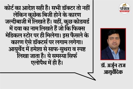 डॉ. अर्जुन राज (आयुर्वेदिक) का कहना है कि डॉक्टर की खराब हैंड राइटिंग को लंबे समय से बहस चल रही है। आखिरकार कोर्ट का ध्यान गया और फैसला आया है। अक्सर एलोपैथ के डॉक्टर कोडवर्ड में दवा का नाम लिखते हैं। इससे कमीशन कमाने का काम चलता है। साथ ही कुछेक डॉक्टर बिजी रहने के कारण ऐसा करते हैं।