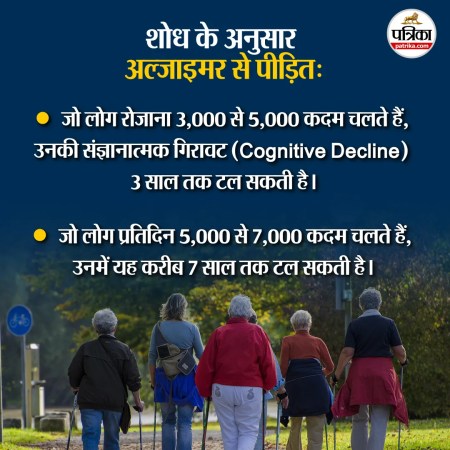300 वृद्ध लोगों पर किया गया ये शोध बताता है कि प्रतिदिन सिर्फ 3,000 से 5,000 कदम चलने से अल्जाइमर में संज्ञानात्मक गिरावट (Cognitive Decline) करीब तीन साल तक टल सकती है। दूसरी तरफ जो लोग रोजाना 5,000 से 7,500 कदम चलते हैं, उनमें यह गिरावट सात साल तक टाली जा सकती है।