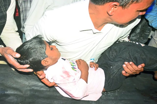 अस्पताल में बच्चे को ले जाते हुए।