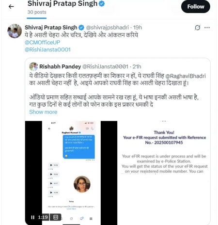 सोशल मीडिया पर हंगामा तब मच गया जब जनसत्ता दल के कार्यकर्ता ऋषभ पांडे ने 28 सितंबर को एक वीडियो पोस्ट किया। इसमें वॉट्सऐप चैट के स्क्रीनशॉट्स के साथ राघवी का कथित वॉइस मैसेज दिखाया गया है, जिसमें अपशब्दों का इस्तेमाल है। पांडे ने लिखा, ये ऑडियो सुनकर किसी गलतफहमी का शिकार न हों, ये राघवी सिंह का असली चेहरा नहीं है… देखिए यहां संस्कारी और पीड़ित बन रही राघवी सिंह कैसे गालियों की बौछार कर रही हैं। पांडे ने खुद को 'किसान का बेटा बताते हुए मुख्यमंत्री योगी से सुरक्षा की मांग की और कहा कि राघवी ने उन्हें धमकी दी है।
