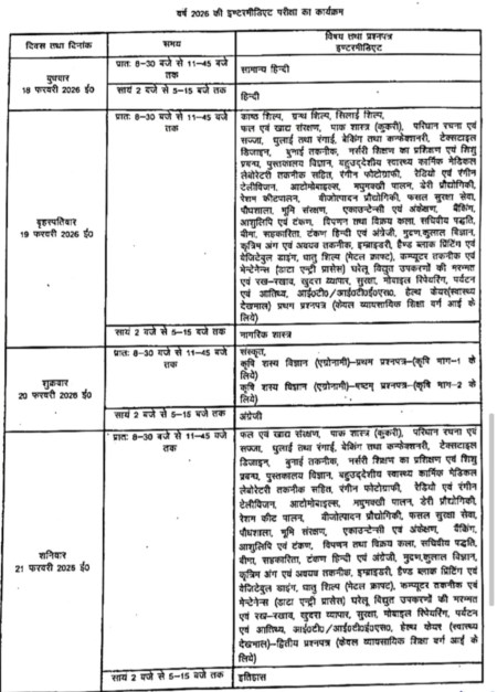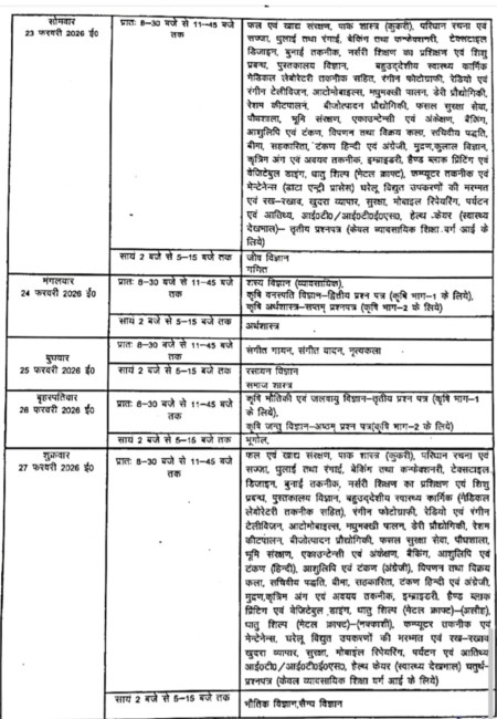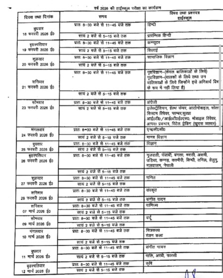 उत्तर प्रदेश माध्यमिक शिक्षा परिषद से जारी टाइम टेबल के अनुसार शनिवार 21 फरवरी को बालिकाओं के लिए गृह विज्ञान की परीक्षा होगी। इसके साथ ही बालकों और उन बालिकाओं के लिए जिन्होंने इसे अनिवार्य विषय के रूप में नहीं लिया है। आयोजित की जाएगी।