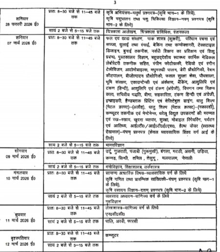 शुक्रवार 27 फरवरी को फर्स्ट मीटिंग में गणित का पेपर है। जबकि शनिवार 28 फरवरी को संस्कृत का पेपर होगा। लंबे गैप के बाद 7 मार्च शनिवार को वाणिज्य, 9 मार्च सोमवार को उर्दू, मंगलवार 10 मार्च को चित्रकला, रंजन कला, बुधवार 11 मार्च को फर्स्ट मीटिंग में संगीत गायन और अंतिम दिन 12 मार्च बृहस्पतिवार को कृषि विषय का पेपर है।