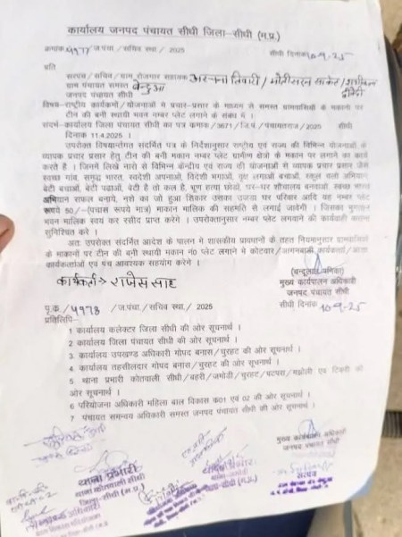 सीधी जनपद पंचायत के सीईओ ने 10 सितंबर को आदेश जारी किया था। जिसमें लिखा था कि राष्ट्रीय और राज्य की विभिन्न योजनाओं के व्यापक प्रचार-प्रसार के लिए टीन की बनी मकान नंबर प्लेट ग्रामीण क्षेत्रों के मकान पर लगाने का काम करते हैं।