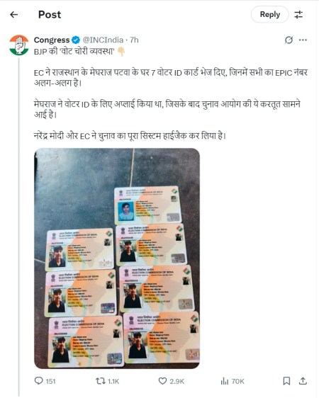 सभी 7 वोटर आइडी का फोटो शेयर करके कांग्रेस के नेता लगातार सोशल मीडिया पर बवाल मचा रहे हैं। कांग्रेस के मुख्य पेज से भी इस मसले को उठाया गया है। कांग्रेस ने पोस्ट साझा करते हुए पीएम मोदी और चुनाव आयोग पर पूरा सिस्टम हाईजैक करने का आरोप लगाया है। कांग्रेस ने इसे 'वोट चोरी' का मामला कहा है।
