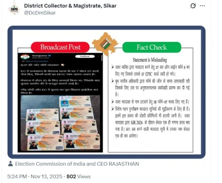 दूसरी तरफ जिला निर्वाचन आयोग ने फैक्ट चेक करने के बाद कांग्रेस के एक्स हैंडल से किए गए पोस्ट को भ्रामक बताया है। जिला निर्वाचन अधिकारी ने कहा कि उक्त व्यक्ति ने 7 बार आवेदन कर दिए थे। बूथ स्तर पर बीएलओ की लापरवाही सामने आई है। जिले में SIR प्रक्रिया जारी है, इस दौरान इस तरह के सभी मामले खुद ही समाप्त हो जाएंगे। निर्वाचन आयोग ने कहा कि मतदाता द्वारा SIR 2026 में केवल एक ही गणना पत्र भरा गया है, ऐसे में आने वाली नई मतदाता सूची में उसका नाम सिर्फ एक बार ही आएगा।
