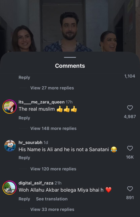 वहीं, कई ऐसे भी लोग है जो अली गोनी की तारीफ कर रहे हैं। एक यूजर ने लिखा कि कोई किसी को फोर्स नहीं कर सकता है। अली की मर्जी है कि वो बोलना चाहते हैं या नहीं। वहीं एक दूसरे यूजर ने लिखा कि किसी के धर्म की इज्जत करने का ये मतलब नहीं कि आप उसको फॉलो भी करें। एक अन्य यूजर ने लिखा कि सच बोलूं तो वो अली दूसरे धर्म के हैं। वो वहां अपने दोस्तों के साथ खड़े हैं। ये बहुत ही अच्छी चीज है।
